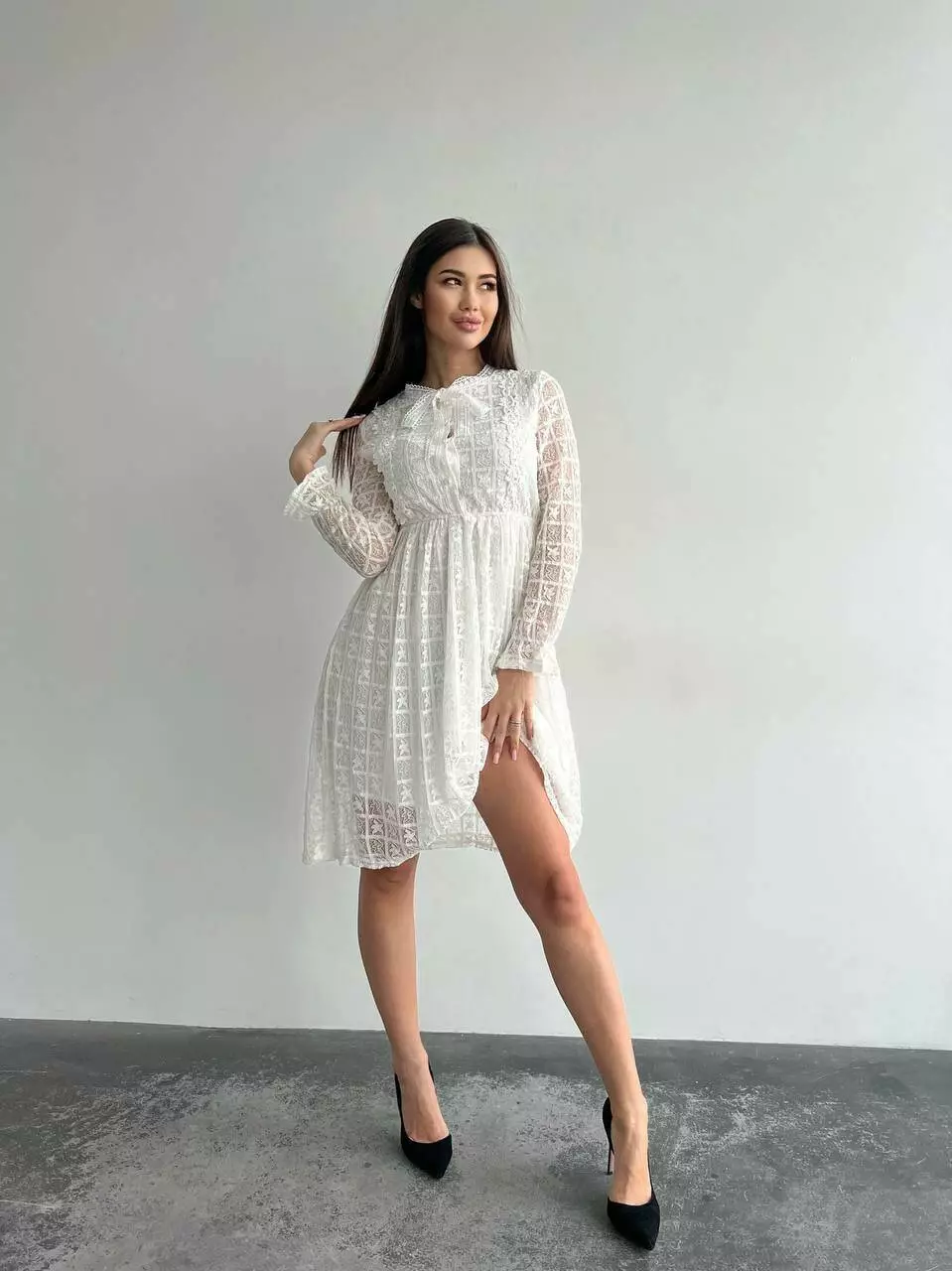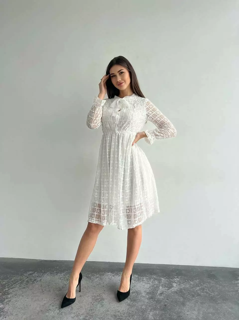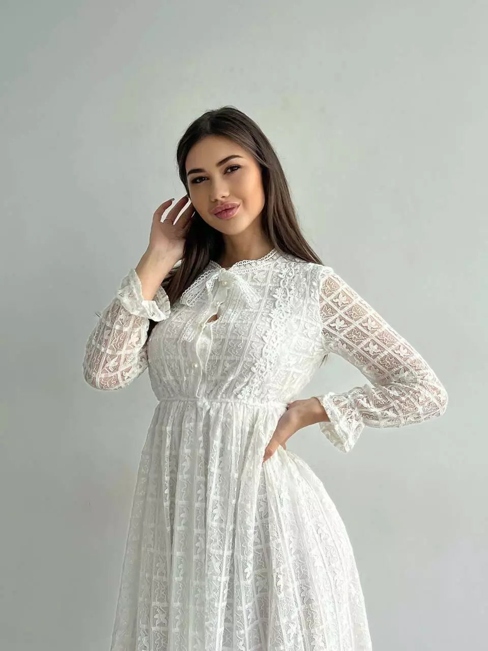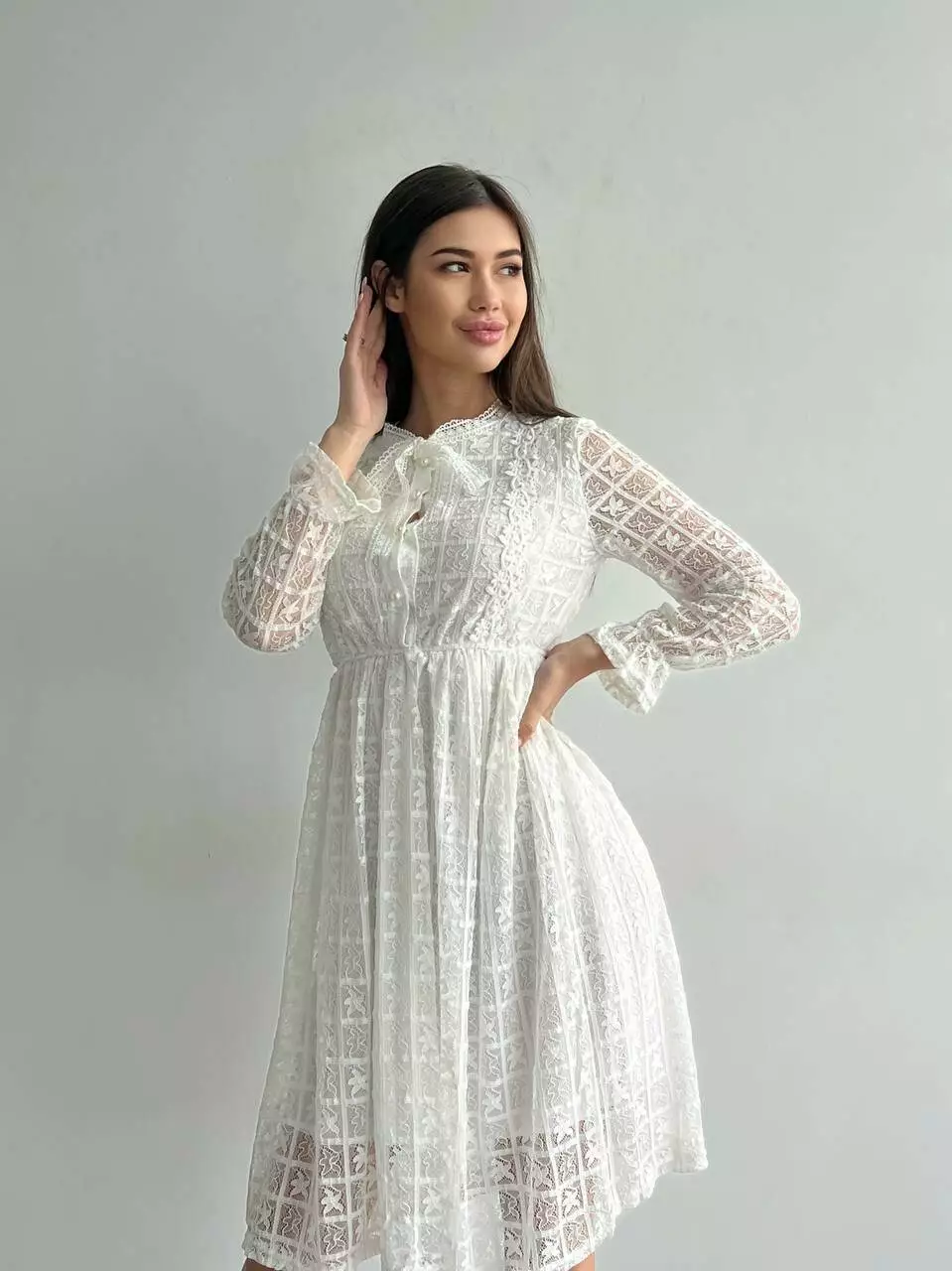 Ніжне гіпюрову сукню жіночий на підкладі з довгим рукавом Колір айворі 1907